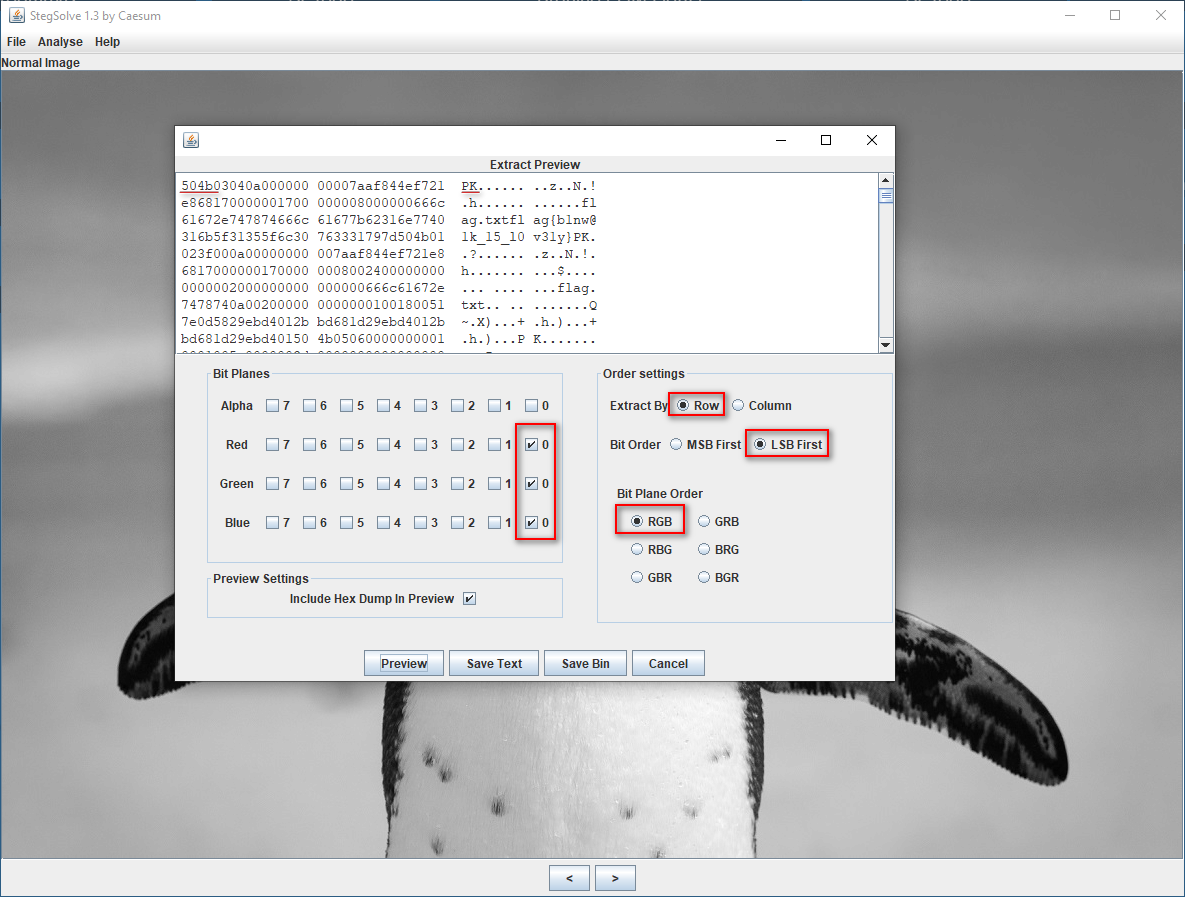 También es habitual usar herramientas como StegSolve. En este caso debemos dirigirnos a Analyse > Data extract para comprobar lo encontrado por zsteg y extraerlo mediante Save Bin.